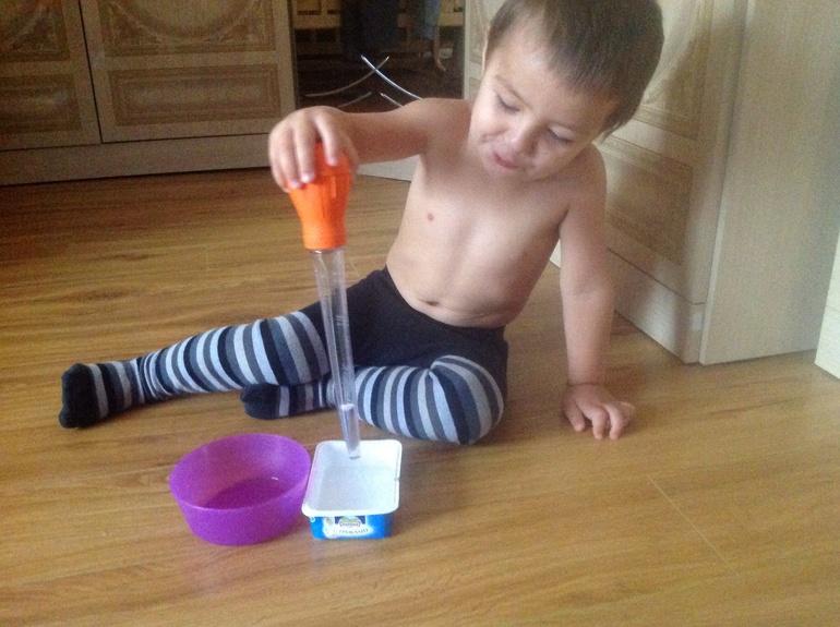 2.4. Занятие с огромной пипеткой очень понравилось сыну, он долго сидел переливал из одной посудки в другую. Вообще ему очень нравятся игры с водой.
