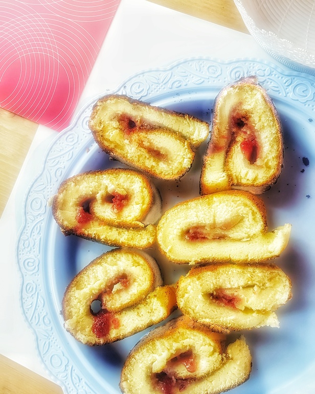 3яйца с 1 стаканом сахара взбила, пол стакана кефира, взбила, пол чайной ложки соды, взбила, стакан муки, взбила и на противень 15 минут при 180 градусах. (Заранее разогрела духовку). Я на бумагу выливала. Вынула, намазала 2/3 брусникой и завернула, главное горячим завернуть... и отправила в духовку минут на 10 еще. Вкуснотища!!!