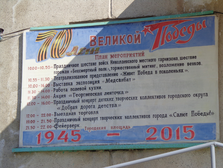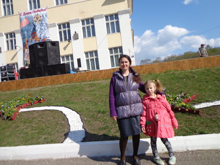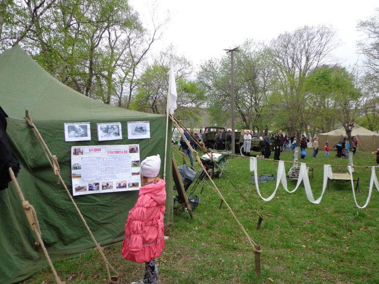 Работала полевая кухня, кормили гречневой кашей и чаем с хлебом. В прошлом году мы пришли поздно и уже каша закончилась. В этот раз смогли взять чай с хлебом. Злата заняла в очереди хлебное место, до каши очередь не дошла, очень много желающих, мы не стали так долго ждать, хотя девчонки очень хотели попробовать солдатскую кашу. Понравилась интересная выставка: военный госпиталь. Зашли посмотрели как в полевых условиях лечили солдат. В час дня был концерт различных детских коллективов. Вечером продолжение концерта и праздничный фейерверк.