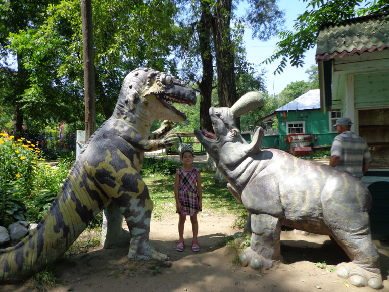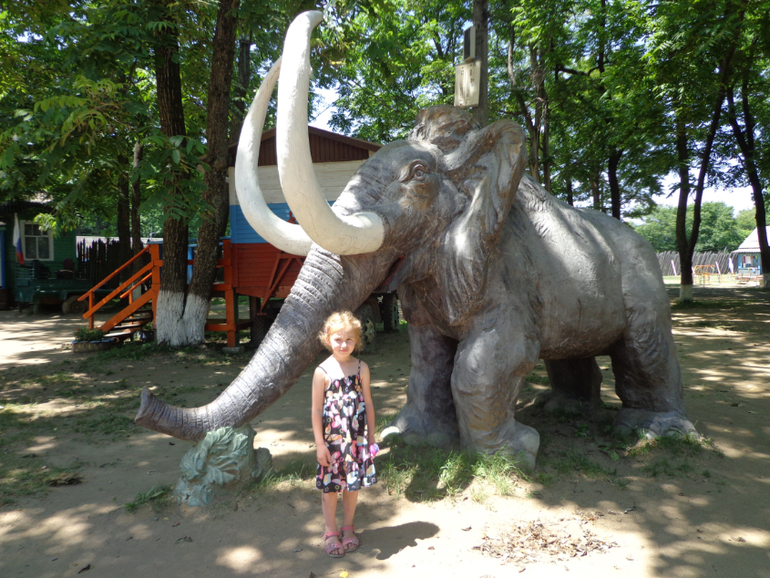 На территории лагеря скульптуры динозавров, мамонт, животные разные.