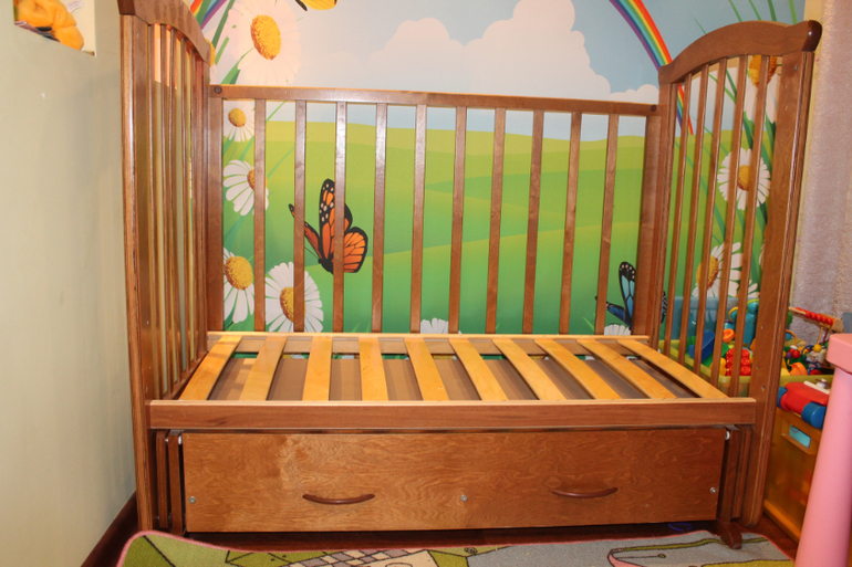 У кроватки есть вместительный ящик для детских вещей. А также механизм, позволяющий укачивать малыша (поперечный маятник). маятник может быть зафиксирован.
