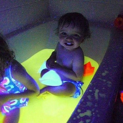 Чтобы вода в ванной светилась, как белая блузка на дискотеке в свете неоновой лампы, достаточно растворить в ванне 2 крупные таблетки витамина В (45-60 мг каждая). Чтобы свечение было ярким, выключите в ванной комнате свет и установите лампу около ванной (только будьте внимательны, чтобы лампа не упала в ванну, и не оставляйте детей без присмотра!)