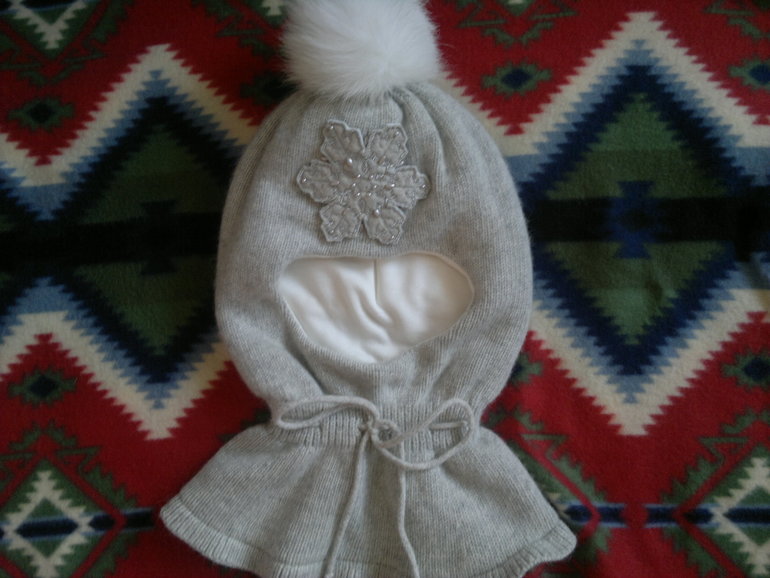 Теплый шлем из ангоры для девочки с манишкой, полностью закрывающей шею и плечи, декорирован вышивкой в виде снежинок с жемчужными бусинами, и песцовым помпоном. Шлем продублирован в области головы и ушей специальным гипоаллергенным утеплителем, а также хлопчатобумажной подкладкой. В области шеи шлем фиксируется с помощью декоративных заязок. Изделие прекрасно защитит от холода и ветра в морозы. 50% шерсть, 35% ангора, 15% полиамид.
