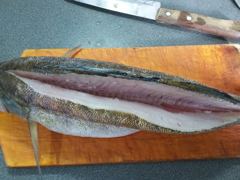 Судака почистить от чешуи, вынуть жабры. Сделать надрезы вдоль хребта:
