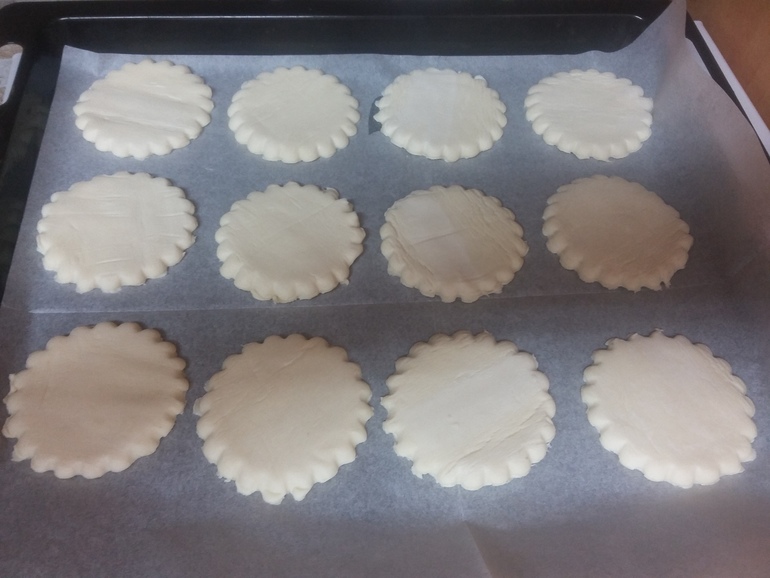 Из слоеного бездрожжевого теста нарезать фигурной выемкой кружки:
