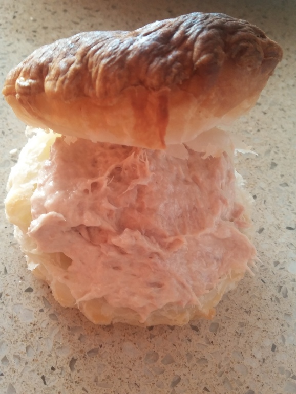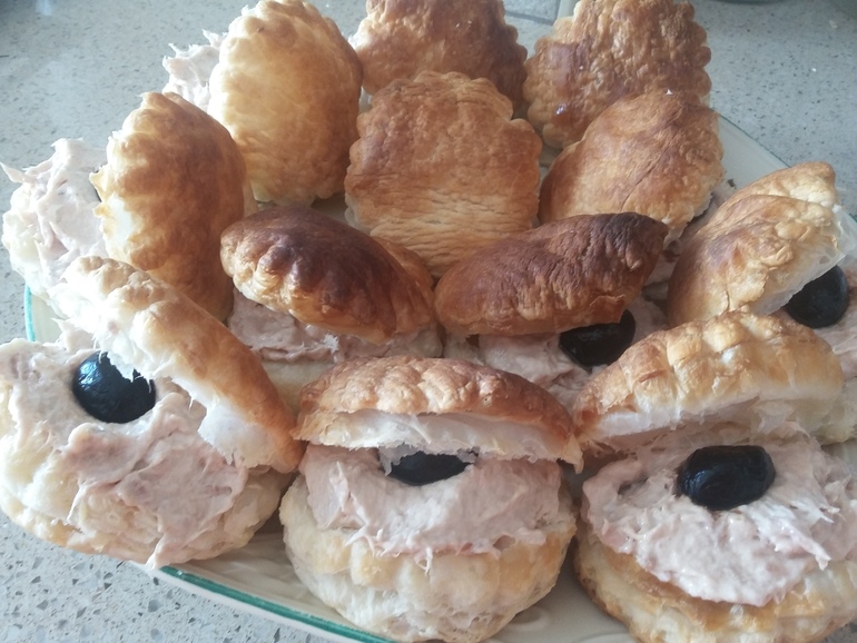 Разделить заготовки из теста пополам и наполнить рыбной начинкой: