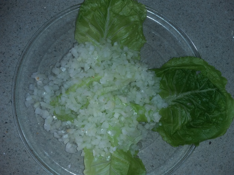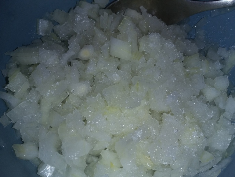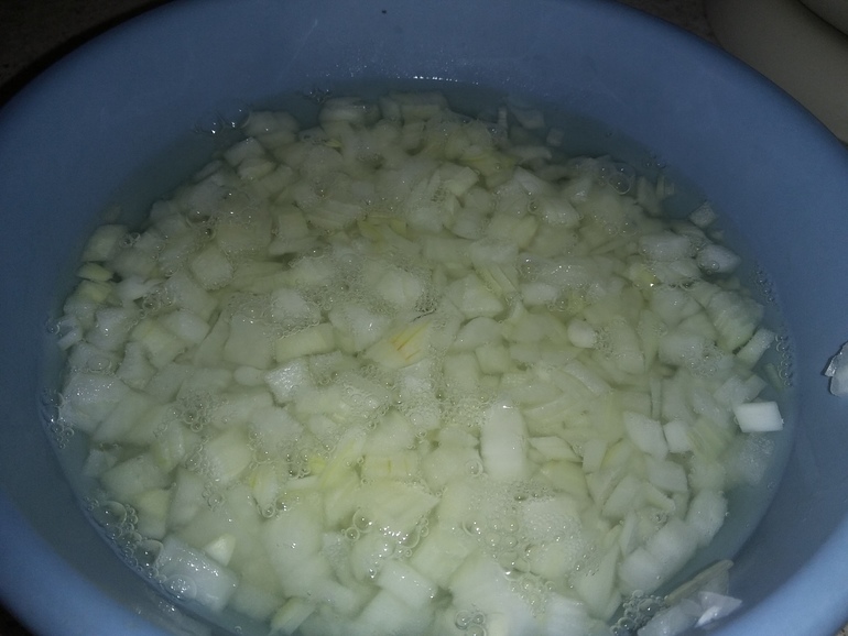 Лук мелко нарезать и залить на 5 минут кипятком: