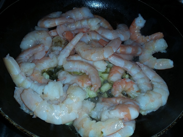 Добавить очищенные королевские креветки, обжаривать минуту: