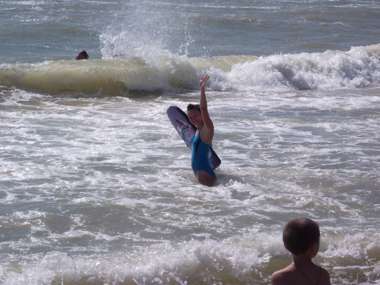В черном море волны не большие, максимум 3 метра - поэтому нам оставалось только романтически мечтать о катании на ногах в океанических волнах) И довольствоваться *как теперь это называется* боди-сёрфингом, просто говоря - виртуозным катанием пузом на доске))) Я до синих губ в полнейшем щенячьем счастье не вылезала из воды по 1,5 часа. И это в штормовом августе, когда небо затянуто облаками - а на берегу ждал горячий термос с чаем, я куталась в махровый халат по глазки, тянула свой чаёк и любовалась штормящим морем. А на горизонте никого...... ни одно сумасшедшего который бы осмелился дальше чем по колено войти в воду и пляж пустой... Если на горизонте вдруг замечалась фигура идущая в воду - это мог быть только один человек - мой брат)) И мы кидались в волны, с привязанными за руку досками-пенопласками, порой волны нас складывали пополам книжечкой так что попа била затылок, порой прибивало ко дну и тащило - так мы соображали КАК ведут себя волны и КАК с ними совладать, порой нас протаскивало метров по 20 по берегу и наконец-то остановившись мы, исполосованные то там то сям царапинами о ракушки, выплевывали полный рот песка и камешек и ржали катаясь держась за животы))) два загорелых чёртика)))