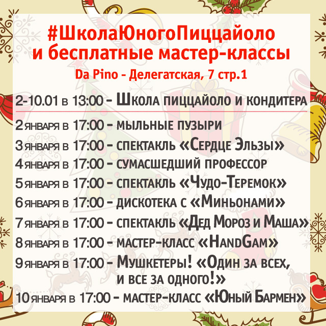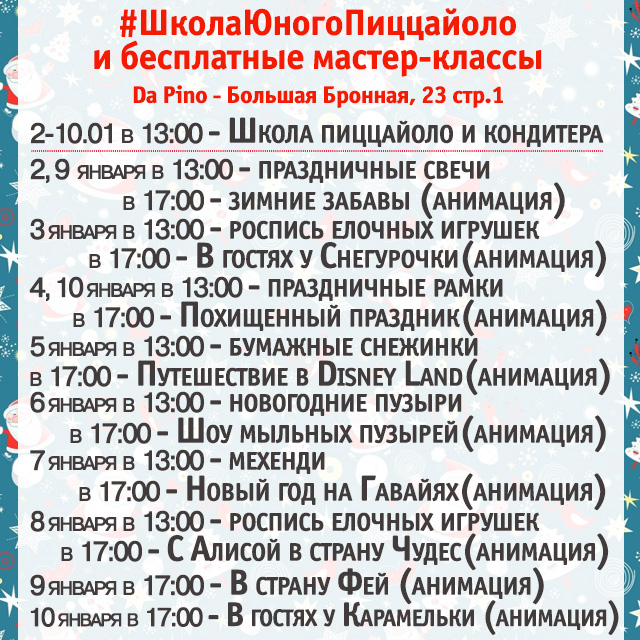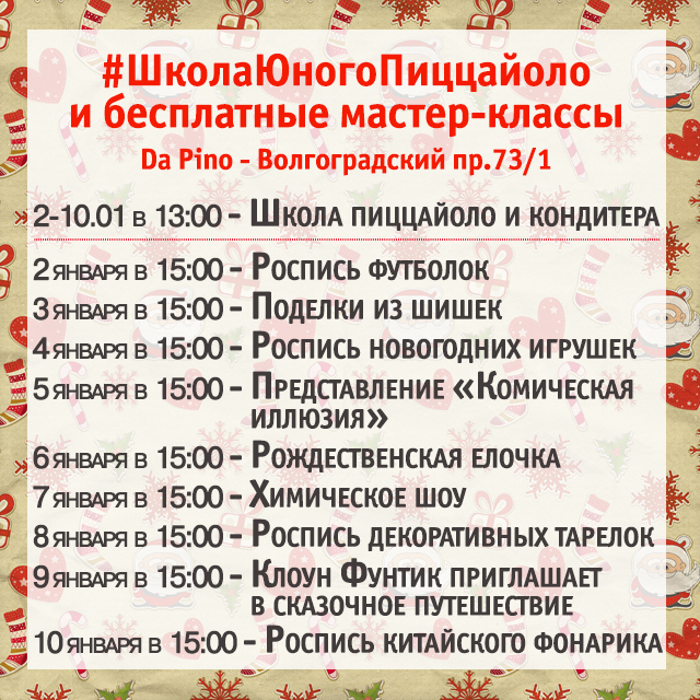 Дорогие мамы! Мы приглашаем вас в новогодние праздники со 2 по 10 января на бесплатные кулинарные "Школа юного пиццайоло" и творческие мастер-классы, а также на анимационные программы.