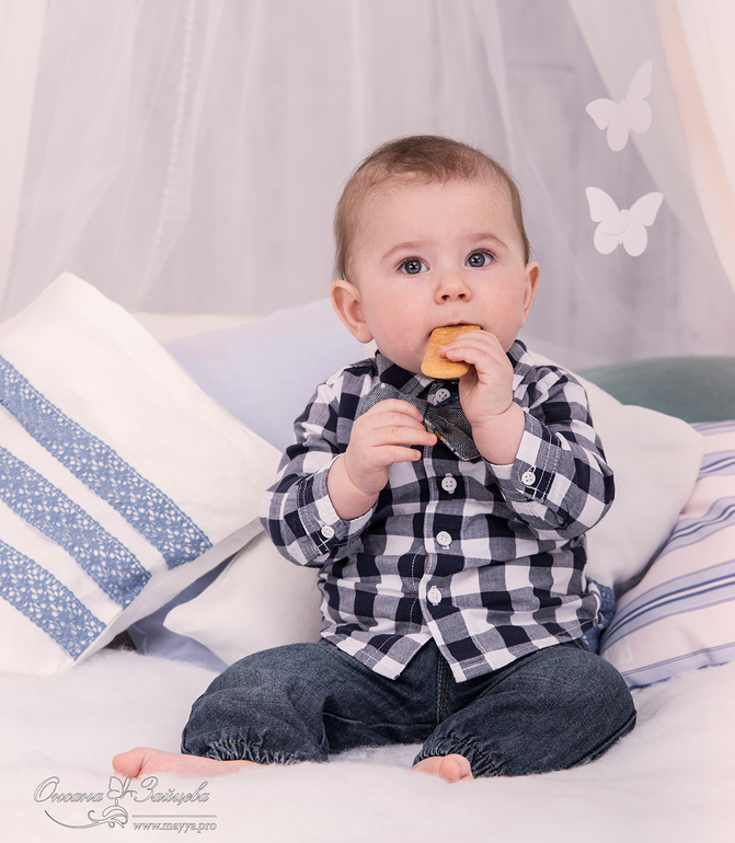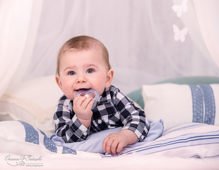 Вчера у нас в гостях в студии был малыш по имени Владимир. Он оказался очень серьёзным и сосредоточенным ребёнком. Чем мы его только не развлекали, но Вова все время был занят тем, что усердно грыз всё, что попадало к нему в руки. У малыша просто резались зубки. Так у него во рту побывали: бумажный помпон, машина, печенье, сушка , ложка, коробочка тик-так, пустышка….