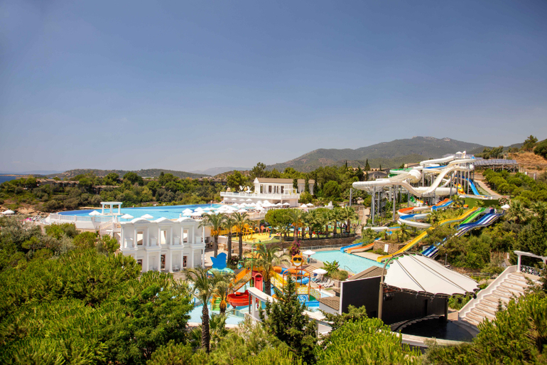 Крытый бассейн. 2 открытых бассейна: Инфинити ( панорамный) 3000 м3 и активный 1600 м3. 2 аквапарка: с 7 и 5 горками. Детский (отдельный) аквапарк.
