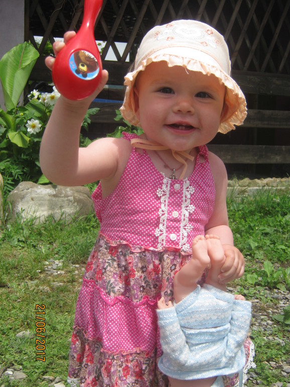 Понимает и выполняет иногда просьбы. Говорит мама, папа, ляля, бабах, дай, и на своем, часто поет. Очаровашка и улыбака. Бурно реагирует на собачек.