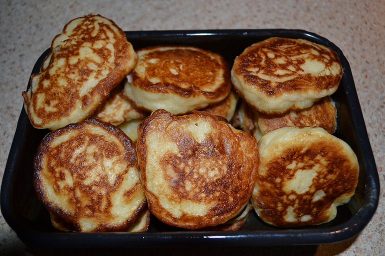как у бабушки! на кипяченном кефире..пальчики оближешь, со сметанкой самое оно, Лиза ела с сахарной пудрой..воздушные и нежнейшие..