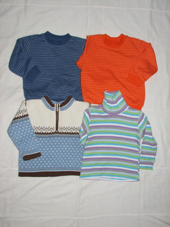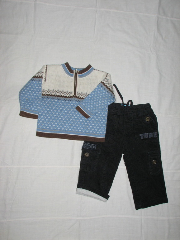 Джемпер размер 80, 100% хлопок, толстый. Качество отличное, после стирки не растягивается и не теряет форму. Цена 200 рублей. Брюки вельветовые на хлопковом подкладе, размер 18 месяцев. Цена 150 рублей.