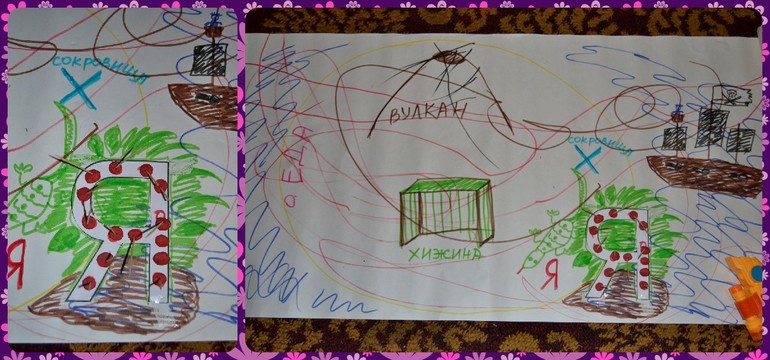 Ловил акул, проводил всех домочадцев к острову (кружок синий). Букву Я вспомнили т.к. на сотрове поселилась ящерица.