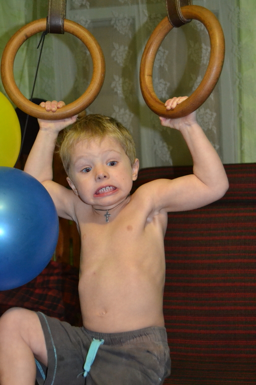 Со старшим сыном занимается муж. Они ходят на тренировки (вдвоём , на взрослые тренировки), занимаются в тренажёрном зале, дома борятся и отрабатывают приёмчики. Мы решили , что нашего малыша надо подготовить и физически и морально к настоящим тренировкам в группе. Дома есть шведская стенка с кольцами,канатом и веревочной лестницей, батут (но уже маловат), велосипед, самокат, толокар (высокий мопед)