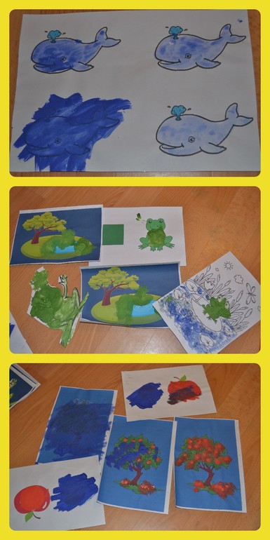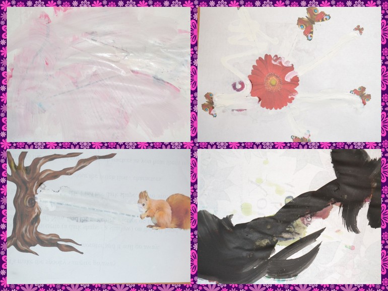 Линии фломиком или ручкой рисовать не хочет, а вот краской:-)))) на ура! Радует, что не на всех картинках закрасил персонажей:-).