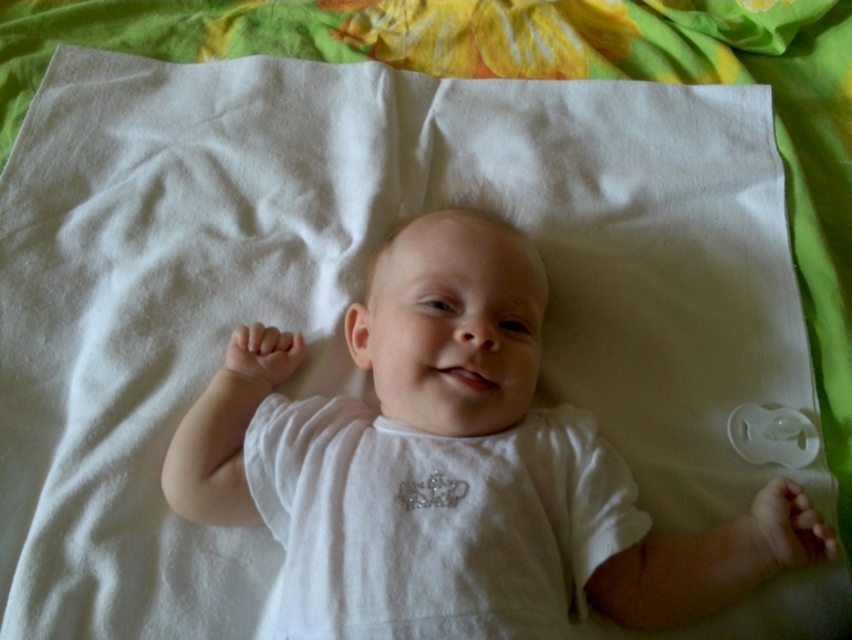 С умелками все хорошо, я не успеваю следить, когда она там что должна делать. Но вот только недавно, я ей в ручку погремушку вкладывала,а теперь уже все хватает и пытается положить в рот))) 31.07 она целый день переворачивалась с живота на спину, ей это нравилось, но на следующий день забыла об этом и вот уже 2 недели не была за этим замечена)) Еще она смешно ползает и высовывает ноги из кроватки на свободу,пора вешать борта. Коврик стала любить больше, чем мобиль, так как там можно ногами и руками работать. Разговариваем и улыбаемся целыми днями.