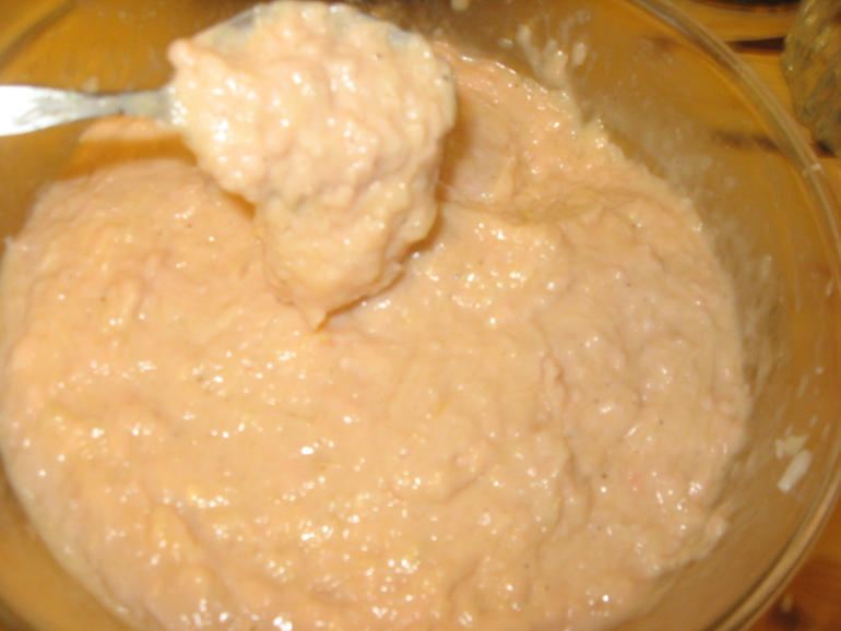 Хорошенько перемешиваем, масса получиться чуть гуще, чем тесто на оладья, т.е. вязкая.