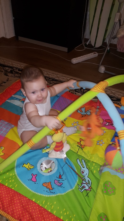 Прям ели успеваю следить за ней! Сегодня ночью проснулась переложить её на другую сторону кровати, и на минут 10 залипла глядя на нее, такая большая стала🙈 С каждым днем она придумывает все новые и новые способы, чтоб меня рассмешить! Недавно я оставила её на кровати и пошла на кухню сделать чай, прихожу и вижу такую картину: сидит Кира и бьет руками по телефону, из которого разговаривает с ней моя мама! Оказывается Кирюха как то позвонила бабушке, еще и громкую связь включила. Как только мама ответила, Кира начала болтать с ней! А вообще телефон, это наше все, а если он еще и светится, то визг счастья стоит на весь дом! Из умелок: этот месяц был очень насыщенным. Как только стукнуло 6 месяцев, Кира начала учится садится, села в 6.5 месяцев с четверенек, на следующий день поползла,а еще через 3 дня встала! Зубки так и не вылезли, хотя несколько дней я их очень ждала. Из за этих нескольких дней, наш режим сместился на 1.5 часа (но я очень этому рада) раньше на ночь мы укладывались в 20:30. А потом настали эти дни, дни моего ужаса! Проснулись мы счастливые и улыбчивые, покушала, погуляли и пришло время обеденного сна (он у нас самый длинный 2 часа) уснула, но проснулась через 15 минут с красными невыспавшимися глазами, через 10 минут начала капризничать, чтобы я не делала после этого, все было в пустую! Ей не нравилось нечего!!! На ночь кое как уложила ее в 23 часа. И сама без задних ног вырубилась рядом. На следующий день все повторилось, только ужас начался с самого утра! А на третий день снова улыбчивый ребенок и как буд то нечего и не было! Но за то теперь отбой у нас в 22 часа и подъем в 8:30 а не в 6-7 утра как раньше!