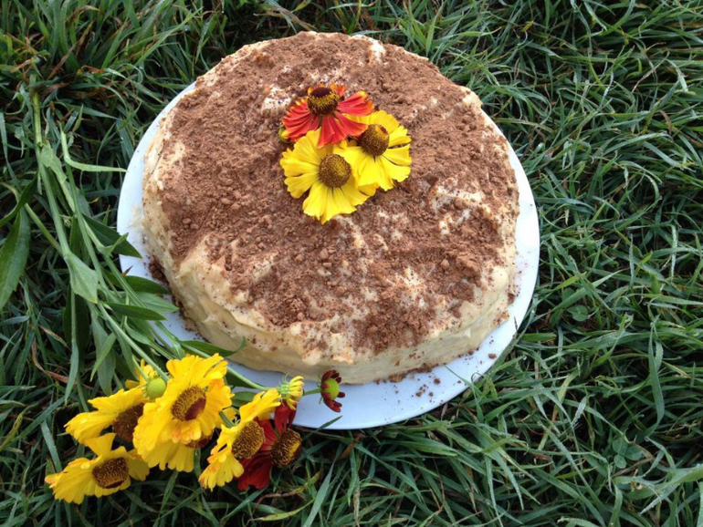 Пища телеснаяСделала вчера торт по рецепту Высокой кухни. Только вместо 6 слоев сделала три и украсила по простому, по дачному.