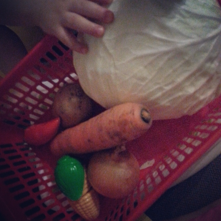 Во вторник изучали овощи. Разбрасывали по комнате, потом собирали. Очень быстро наш овощной магазин превратился в ресторан, так как большая часть ассортимента была настоящей. Все что можно было, погрызли, попробовали.