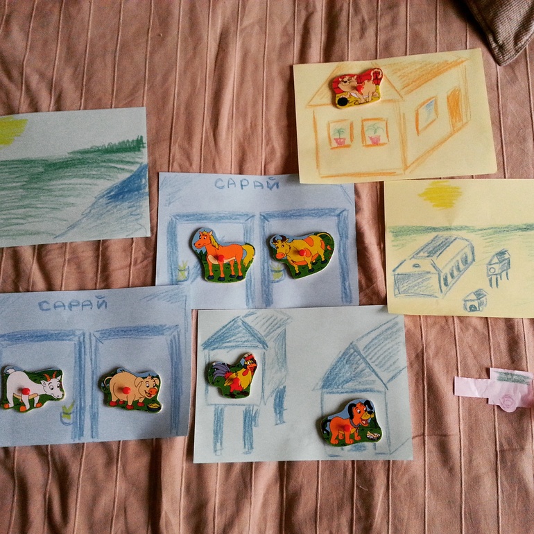 В среду организовали ферму, правда мой сын очень быстро в игру включил автомобили, ну так и продолжил. Я произносила звуки животных, рассказывала кто где живет и чем занимается. Только автомобили были вне конкуренции ) ) ) )