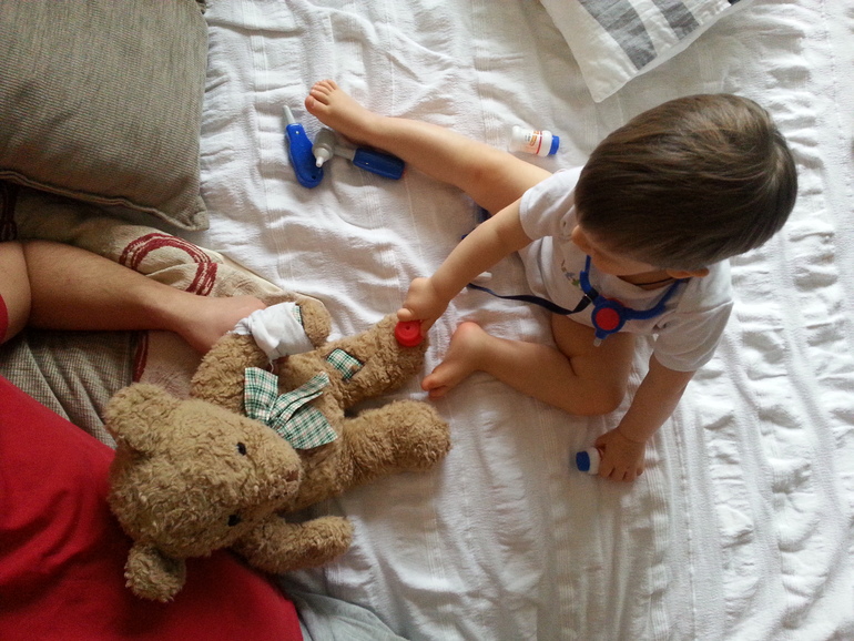 В пятницу был салон красоты для игрушек в ванной. Всем вымыли голову, прически сделали. Конечно же сын был главным посетителем.