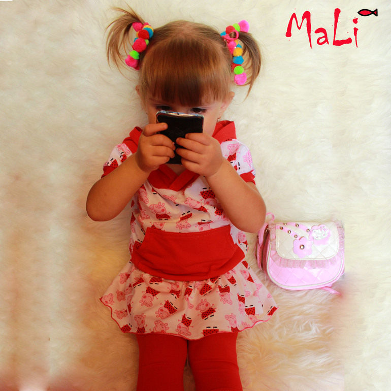 Любимая Свинка Пэппа, на костюмчике Лизаветы. Это Лиза в сад собирается в зеркальце прихорашевается.