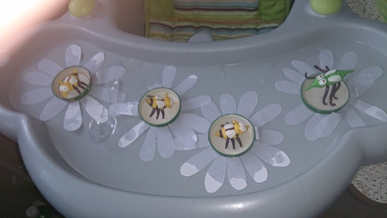 Поили нектаром пчел и комара (фигурки из MosquitoDjeco), переливали нектар ложкой. Наливал в первую крышечку, во 2, 3, и 4 приходилось просить налить. Потом рассаживали насекомых "пить водичку-нектар". Понравилось, с удовольствием плескался, мыл ручки в миске, воды налили кругом.