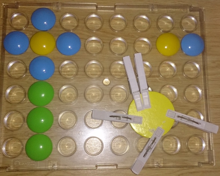 Наш вариант ромашки из мозаики и тут же из прищепок и картонного кружочка. Это второй вариант. Он научился цеплять прищепки (с помощью). Первый раз я помогала правильно взять прищепку, открыть ее, прицепить на кружок. Второй раз - взять, открыть, а цеплял уже сам. Это прогресс, раньше не понимал прищепки вообще.