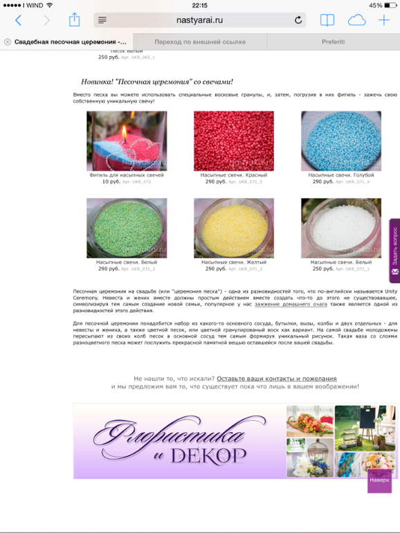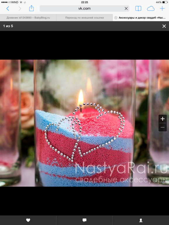 Оль, гранулы я-бы не советовала — они не очень красиво сыпятся и в бутылке (за счет того, что они крупнее песка) они могут просыпаться друг через друга и рисунок со временем "просядет"! Песок-же, за счет своей мелкой структуры, сыпется сразу достаточно плотными слоями и не двигается! Мы своим свадьбам уже несколько лет эту церемонию проводим и, как говорится, уже собаку на этом съели))) А если нужен какой-то необычный цвет, который не получается купить в магазине, то в нужный цвет красим... мелкую соль! Растирается цветной мел (обычный детский!) и смешивается с солью!ПиСи: И еще обязательно надо сразу продумывать бутылочку с плотной пробкой/крышкой, а еще лучше саму пробку сверху залить расплавленным воском и песок сыпать до самого верха и сразу закрывать/заливать воском что-бы ничего не просыпалось! (Вроде мелочь, а про неё часто забывают)))