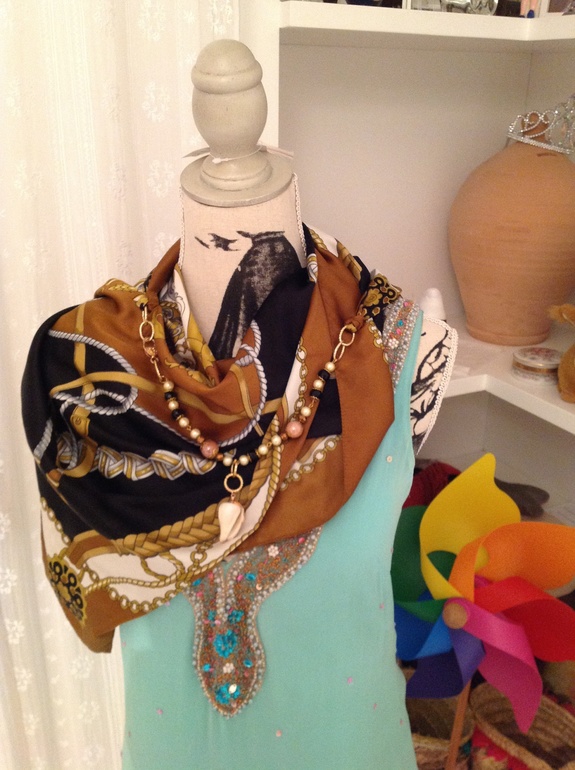 Свернули платок треугольником , закрепили на концах бусы красивые и готово) очень красиво смотрится ! Свекровь носит с удовольствием . У меня куча платков есть . Надо будет Объявить охоту на красивые бусы ) кто со мной?)