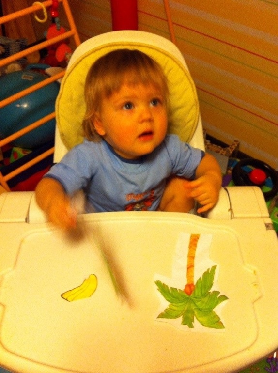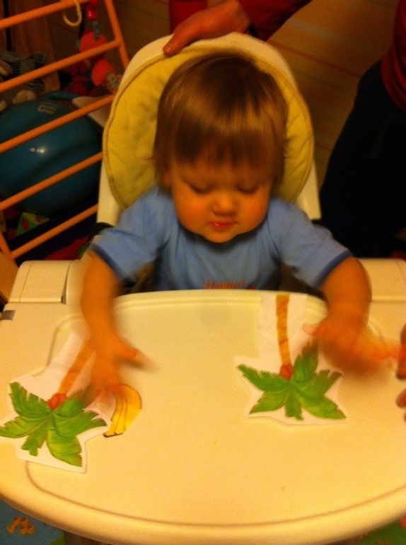 13. Сенсорное восприятие. На подносе соорудили пустыню, песочком была пшенка, поставили фигурки слона, льва, зебры и положили бананы. Туда же вместе Дима с папой построили пальму из конструктора. Это занятие ему понравилось больше всего. Сначала играл животными, потом пытался скушать банан. Ну а дальше превратил всю комнату в пустыню, раскидав пшенку везде!