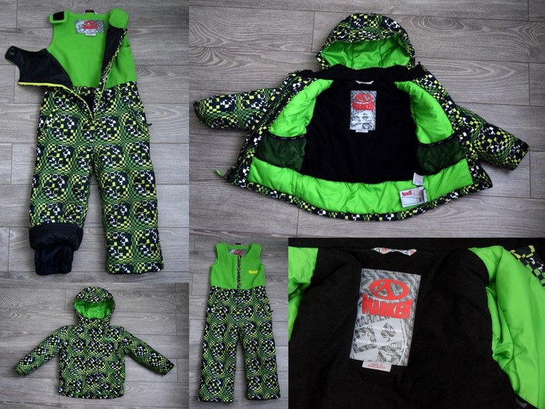 1. Очень теплый и качественный зимний комплект MARKER (США). Размер 2Т, но большемерит на размер. Есть система "я расту" - но я уже распустила эти швы, носили полтора сезона. Ткань приятная, бархатистая - водоотталкивающая. Много кармашков, все очень продуманно. На полукомбинезоне есть резинка, позволяющая регулировать ширину пояса.