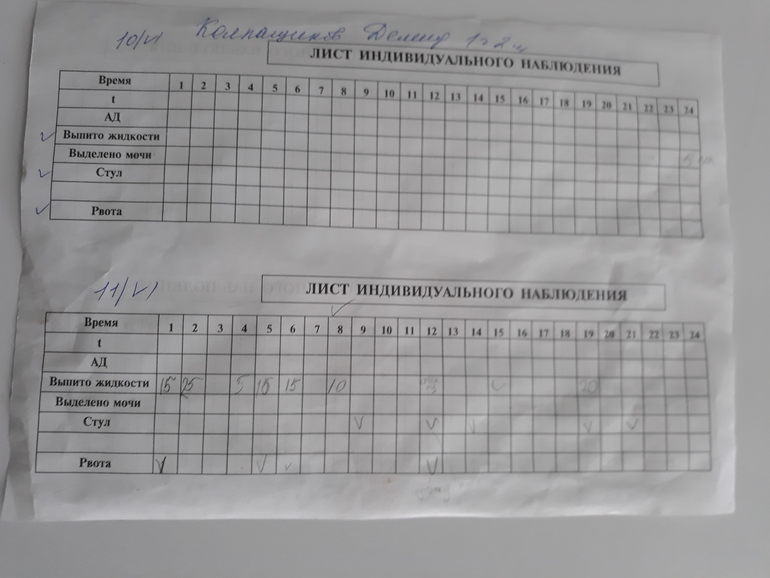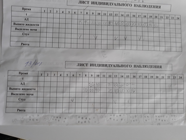 Удобный лист, кстати, так всё наглядно: видно, как сутки Демида рвало, потом поносило. Каждая точка - это шприц с 5мл жидкости.