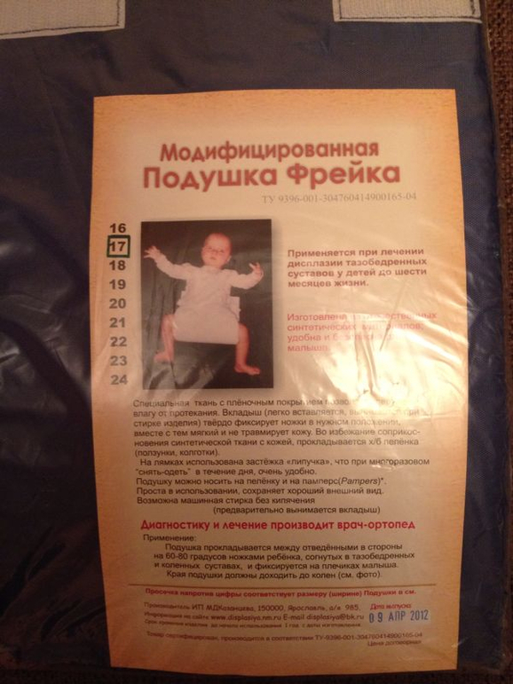 Отдам даром подушку Фрейка 16 и 17 размера. Применяется при лечении дисплазии тазобедренных суставов у младенцев до 6 месяцев жизни. Самовывоз м. Перово.