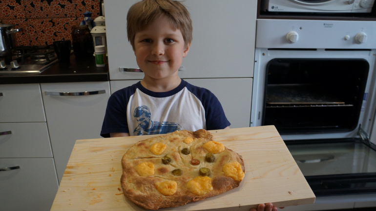 Вернувшись домой после всех праздников, решила я испечь пиццу! Елисей у нас пиццу не ест..... вообще!!!! а готовить любит! Вот и говорит буду я готовить детскую пиццу!!!! Все делал сам, я только говорила что нужно для теста, а пропорции, украшения все сам подбирал! Вообще он все замесит венчиком, а дальше когда дело доходит до того что бы руки "пачкать", он передает все дело мне! Но сегодня я была занята, он на удивление все сам!!!!!