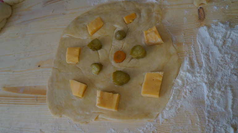 Пицца получилась очень вкусной!!!! (тесто! а из начинки у него пару кусочков сыра, соленый огурчик и морковка маринованная!)