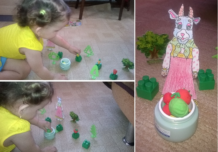 После обеда мама коза предложила посадить свой огород, чтобы больше не ходить в лес и козлята с удовольствием принялись за дело. Юля помогла посадить грядки с морковью, свеклой и капустой (рассортировала и разложила овощи в соответствии с цветами-подсказками на грядках)