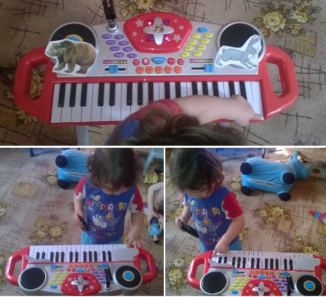В это время в сказочный дом вернулись хозяева, которых мы узнали по походке, у медведя тяжелая походка, у зайца легкая. Мы обыграли шаги наших новых друзей на клавишах детского пианино