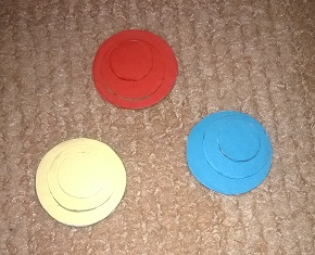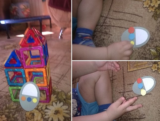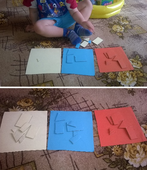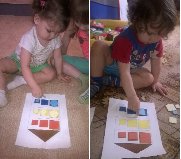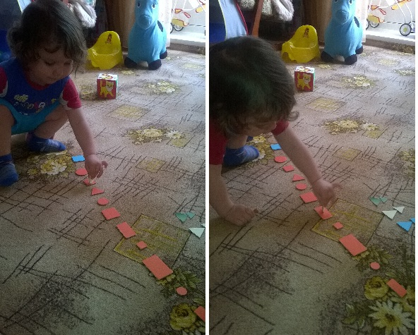 Блоки Дьенеша до нас еще не доехали, поэтому на скорую руку изготовила свои (3 цвета, 4 формы, 3 размера), толщина была одна(