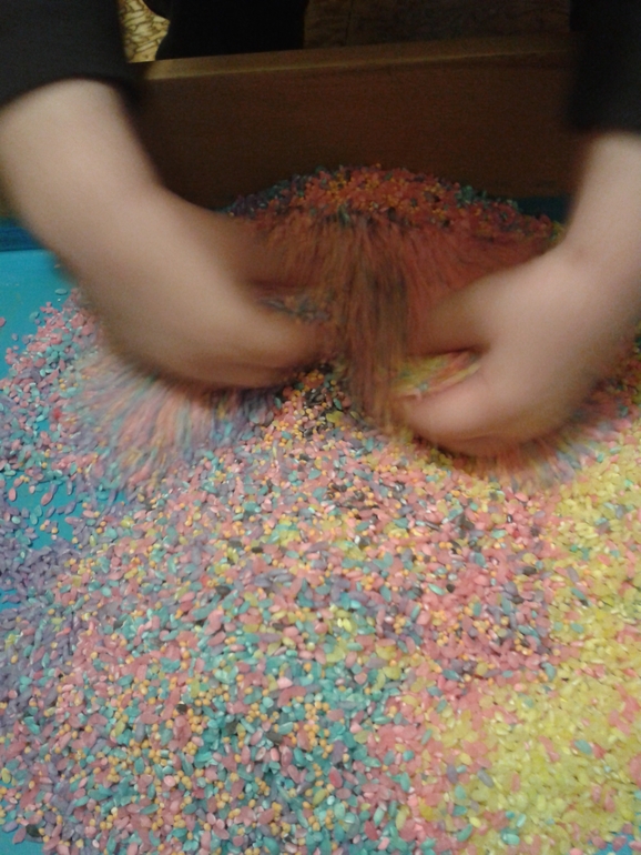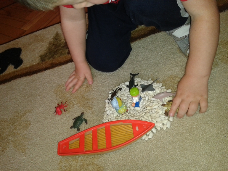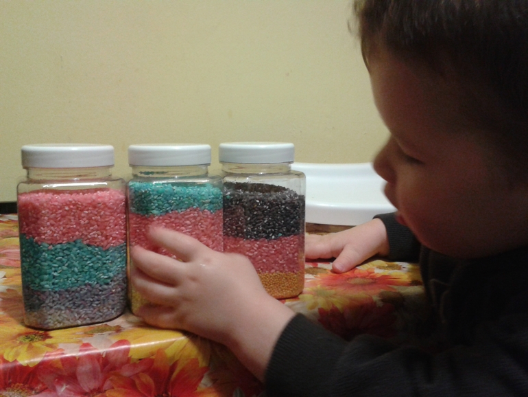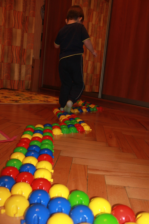 Мишка только начал осваивать горизонтальное положение, а его стопы уже познакомились с мешочком с горохом и жестким ковриком с травой, который обычно кладут в коридоре у порожка, а у нас он лежал в ванной)) и конечно пуговицами нашитых на полотенце, фоток нет, а уже расшила этот коврик и сделала кое-что другое, зато есть мозайка и одновременно массажная дорожка и дорожка на баланс)))