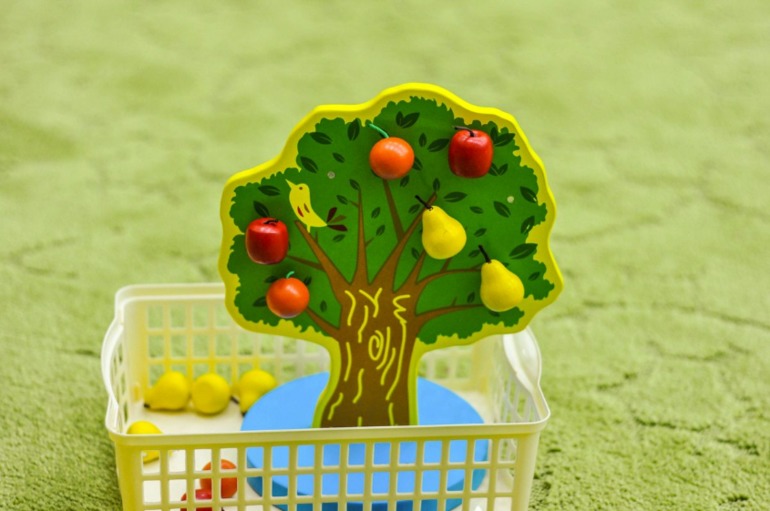 Можно просто вешать фрукты (они на магнитах), а можно потом их считать или решать примеры: висело 3 яблока, одно упало.. сколько осталось?