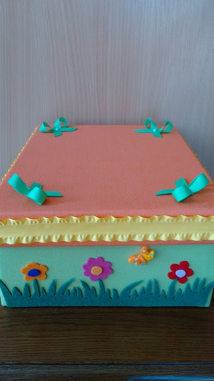 Дали нам в садике задание сделать коробочку в творческий уголок... Со слов воспитателя, просто любую коробку от обуви обтянуть тканью, бантик какой-нибудь навесить и хватит... В эту коробочку детки будут складывать карандаши, ножнички и прочее...