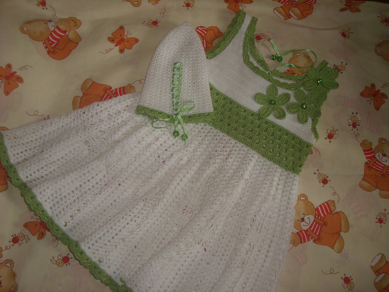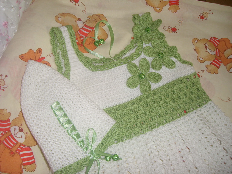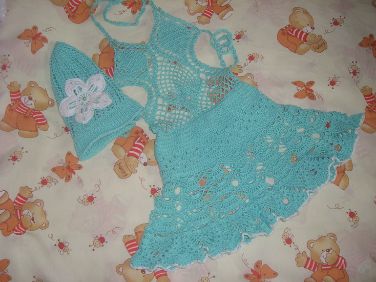 Очень хотелось для доченьки связать сарафан для отпуска, вот что получилось. Ниточки использовала СОСО бирюза, крючок 1,50.