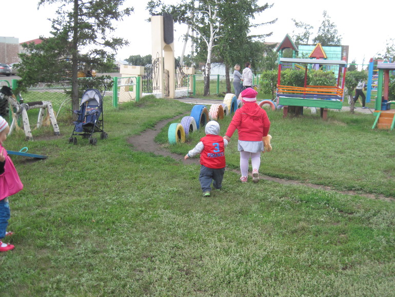 Рассказы о сыночке после годикаВчера после обеда поехали мы с Андреем покататься на коляске и зарулили в детский сад. Деток там не было, и я спокойно вкатила коляску в ворота. Андрей очень любит ходить сюда, садик очень красивый, с новенькой горкой для малышей, качелями. За минуту все участки заполнились выбежавшими из групп детками. Андрюха так обрадовался! Пошел играть с ними сначала в песок, хотя детки явно постарше его, сына это вовсе не смутило. Потом пошел к горке, где большие девчонки ленились подниматься наверх по ступенькам и карабкались вверх по склону. Чуть позже начался дождь, и одна трехлетняя девочка решила взять шефство над Андреем, она пыталась его сначала поднять, а потом, сообразив, что это тщетно, повела за руку в домик, прятаться от дождя. Забавно было. Сын не дичится детей, а наоборот, бежит к ним. Думаю, в садик он пойдет спокойно. Пока мы гостим у родителей, будем ходить по вечерам в сад проходить постепенную адаптацию к детскому обществу)