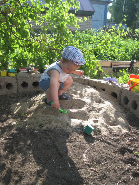 Калитка открывает вид на зеленый двор, в котором растет много деревьев. При входе сын вспомнит многолетнюю высокую лиственницу, достающую до балкона на втором этаже. Справа толпятся березы, куст дикой смородины и огромная раскидистая яблонька чувствуют себя более вольготно - им отведено больше места. В этом маленьком лесу спряталась стопка досок, прибереженных дедушкой для обшивки хозпостроек. Малыш все лето там прятался, изучал каждый укромный уголок. Далее вдоль дорожки к крыльцу растут молодые сосеночки, возможно, через 10 лет мы будем наряжать их к Рождеству прямо на улице! Или рядом будет стоять снеговик, умело слепленный Андреем и его братиками и сестричкой (ну хотя бы одной точно!). Под ветками березки, больше похожей на плакучую ивушку, стоит песочница. Недалеко от нее сидят грядки с клубникой, пытается подняться над всеми остальными кустик красной смородины, отстаивают свою территорию заросли малины, опасливо смотрит на всех колкий крыжовник. Узкая каменная дорожка ведет в баню. Здесь сын раз в неделю парился с дедом. Рядышком расположена поленница с дровишками для растопки. Далее идет бабушкин огород, заканчивает который виноградник. Этим летом сын уже попробовал зеленый виноград, но всю прелесть зарослей лозы он еще не знает. Какой же там можно оборудовать чудесный детский домик! Недалеко от виноградника ютится потрепанная временем деревянная скамеечка прямо под толстым многолетним тополем. В сени этого великана сын спал в первый год своей жизни, а в этом году с радостью играл под ним.