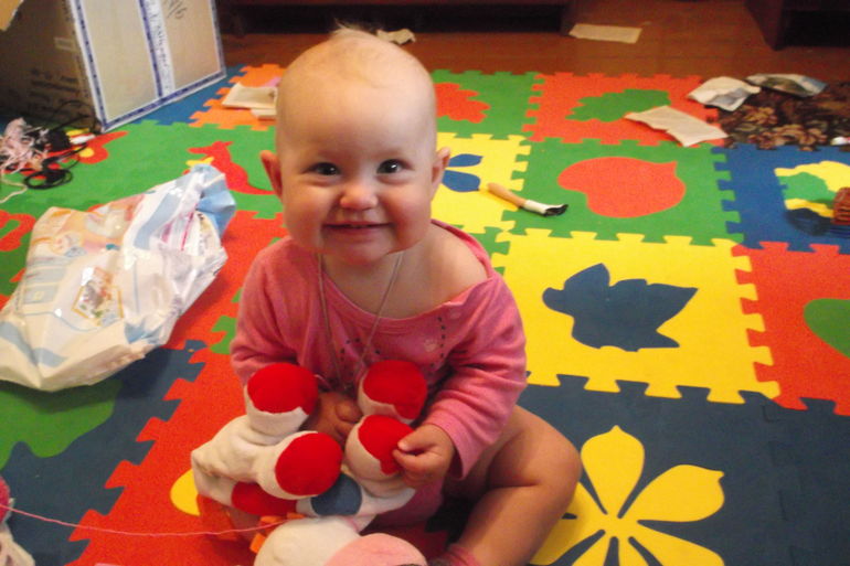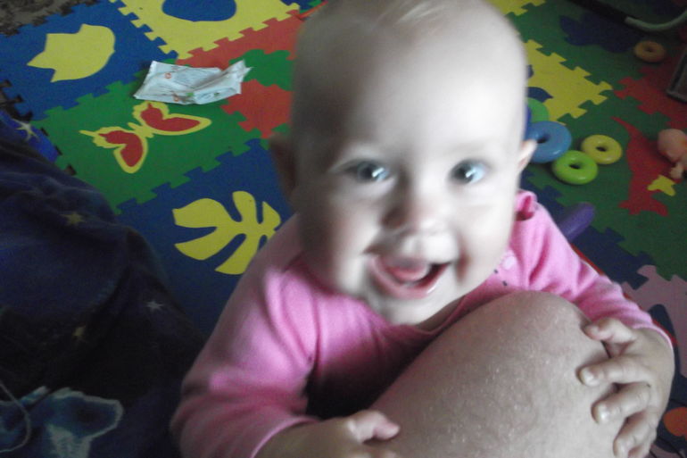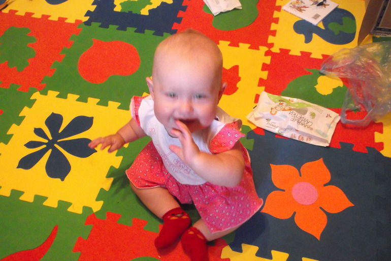 Ну вот нам и 10 месяцев. Решила вот написать, ну и для себя, чтобы не забыть))). Что мы имеем. Дочь Настя 10 месяцев отроду. Маленькая хитрая вреднюська))) Ходить мы еще не ходим сами, только ползаем так, что ну никак за ней не угонишся. Ну и у опоры ходим, неее не ходим даже, а почти бегаем. Сколько рост и вес не скажу, так как уже 2 месяца как мы в деревне живем, ну думаю рост больше 70 см и вес больше 11 кг). Имеем мы 6 зубов, плюс еще 2 на подходе. Зато почти не имеем волос( Ну надеюсь вырастут))). Наконец то мы стали лепетать, да этого тока мама и папа, а счас непонятно что, но рот не закрывается вообще. Машем пока пока, привет привет, умеем мяукать как киска (когда увидит). Любим играть в ладушки, куку и щекотушки (это когда я ее щекочу а она от меня убегает(или уползает) уползет и ждет меня - пока подойду и буду щекотать). Из любимых игрушек - жирафа Пипа, Корова (вообще то это лошадь, но уж больно на корову смахивает), проводочки, ниточки, мячик (вообщем все что можно запихнуть в рот). Начали приучаться к горшку, пока вроде процесс идет успешно, мы даже какаем уже в него))). Из грустного: Сон наш оставляет желать лучшего, но улучшения все таки есть, и овощи мы что то не очень едим, все больше по молочке(((. Ну и еще на носочки встаем (приедем домой - пойдем к неврологу). Обувь, носки - ненавидим, сразу начинаем стаскивать и снимать. Ну и одеваться - не наше любимое занятие. А так..... растем растем растем)))).